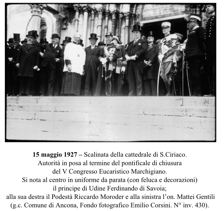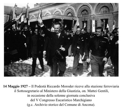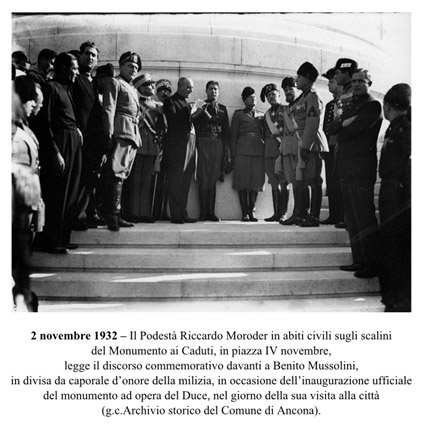 A Riccardo Moroder è toccato più volte l’alto onore di ricevere il re, il duce, il principe di Piemonte ed altri principi di casa reale, che vollero confermare la loro simpatia verso la popolazione marchigiana, come si può vedere in alcune foto (cfr. Mostra fotografica di questo Archivio). E in particolare Benito Mussolini, nella sua visita ad Ancona il 3 novembre 1932, tessé l’elogio della gente marchigiana, “laboriosa e modesta, e che nulla chiedeva pur dando molto alla patria fascista”, elogio che giunse caro a tutti i marchigiani e per primo a Riccardo Moroder, che reggeva il più importante Comune delle Marche.
